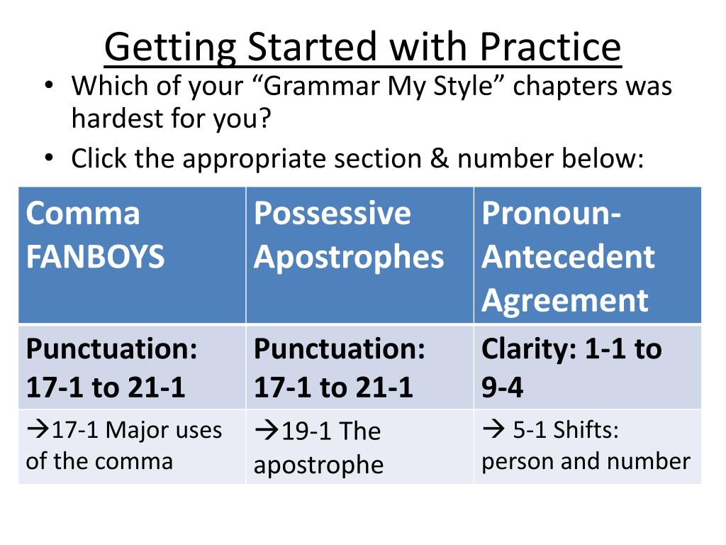 Getting Started with Practice • Which of your “Grammar My Style” chapters was hardest for you? • Click the appropriate section & number below: