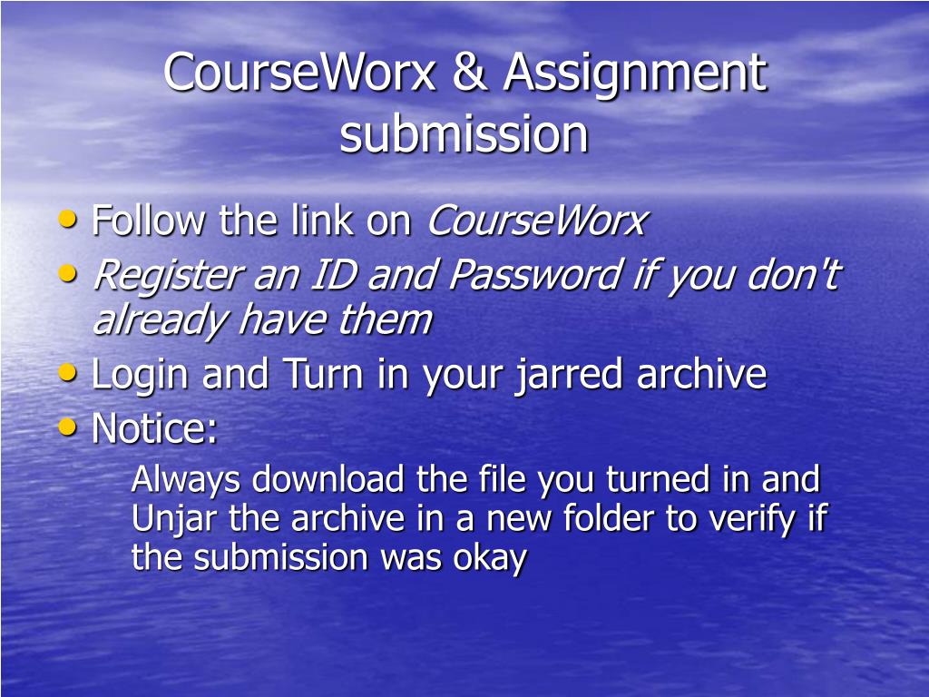 CourseWorx & Assignment submission • Follow the link on CourseWorx • Register an ID and Password if you don't already have them • Login and Turn in your jarred archive • Notice: Always download the file you turned in and Unjar the archive in a new folder to verify if the submission was okay