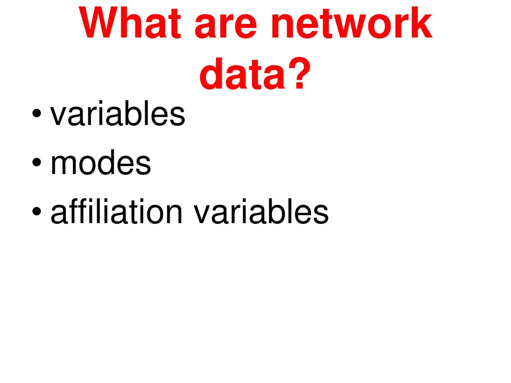 Affiliation Variables each affiliation variable is defined on a specific subset of actors a special type of two-mode network, but they only have one set of actors the second mode is a set of events: such as clubs or voluntary organizations to which the actor belong “events are defined not on pairs of actors, but on subsets of actors (…) often events are informal social occasions, such as parties or other gatherings, and observations or attendance or interactions among people provide the affiliation of the actors ” “subsets can be of any size”
