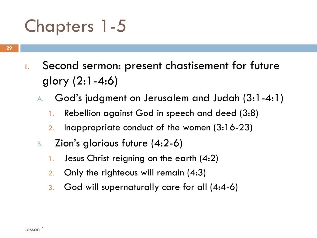Chapters 1-5 • Second sermon: present chastisement for future glory (2:1-4:6) • God’s judgment on Jerusalem and Judah (3:1-4:1) • Rebellion against God in speech and deed (3:8) • Inappropriate conduct of the women (3:16-23) • Zion’s glorious future (4:2-6) • Jesus Christ reigning on the earth (4:2) • Only the righteous will remain (4:3) • God will supernaturally care for all (4:4-6) Lesson 1