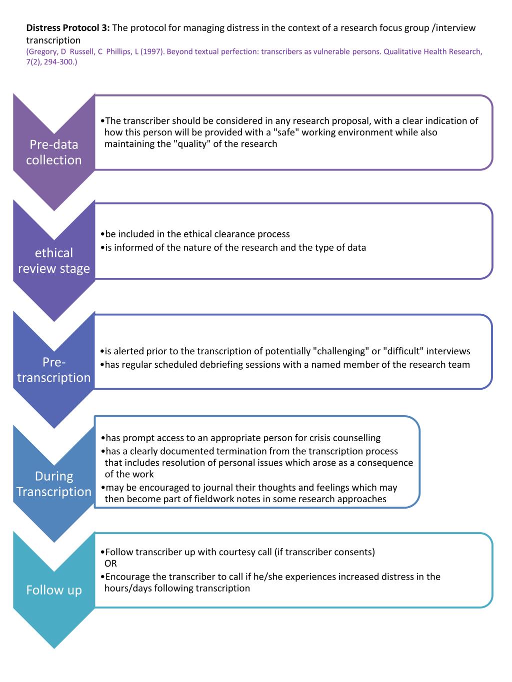 Distress Protocol 3: The protocol for managing distress in the context of a research focus group /interview transcription(Gregory, D Russell, C Phillips, L (1997). Beyond textual perfection: transcribers as vulnerable persons. Qualitative Health Research, 7(2), 294-300.)