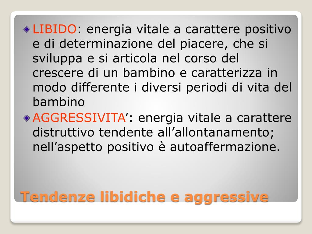 LIBIDO: energia vitale a carattere positivo e di determinazione del piacere, che si sviluppa e si articola nel corso del crescere di un bambino e caratterizza in modo differente i diversi periodi di vita del bambino • AGGRESSIVITA’: energia vitale a carattere distruttivo tendente all’allontanamento; nell’aspetto positivo è autoaffermazione. Tendenze libidiche e aggressive