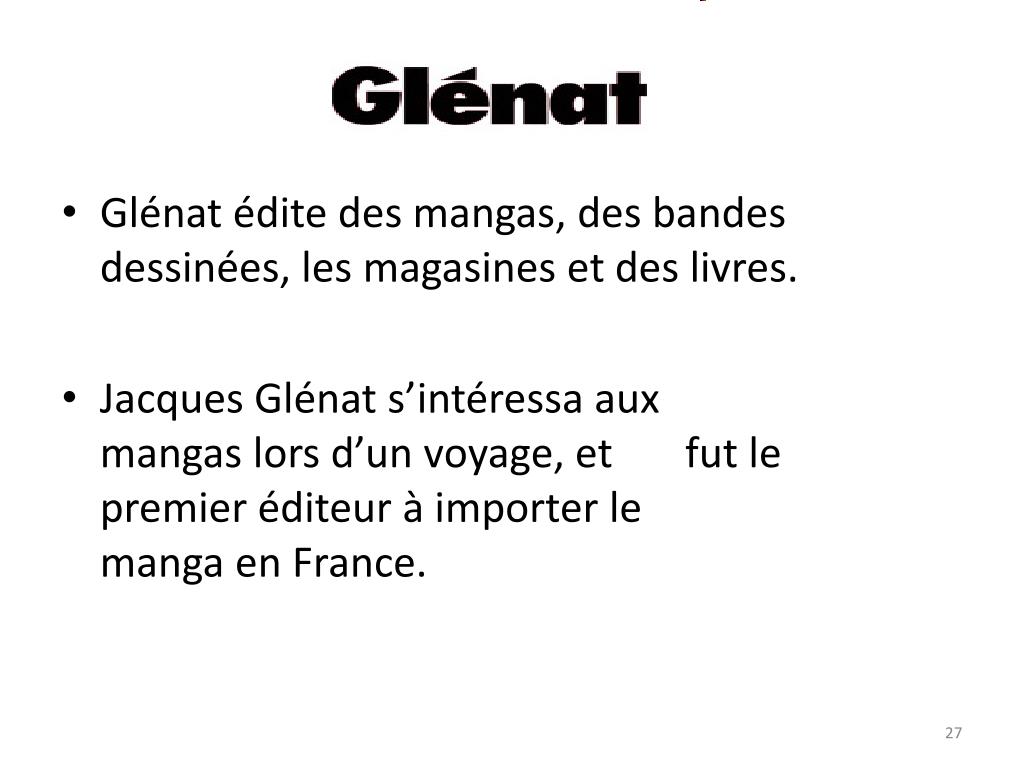 Glénat • Glénat édite des mangas, des bandes dessinées, les magasines et des livres. • Jacques Glénat s’intéressa aux mangas lors d’un voyage, et fut le premier éditeur à importer le manga en France.