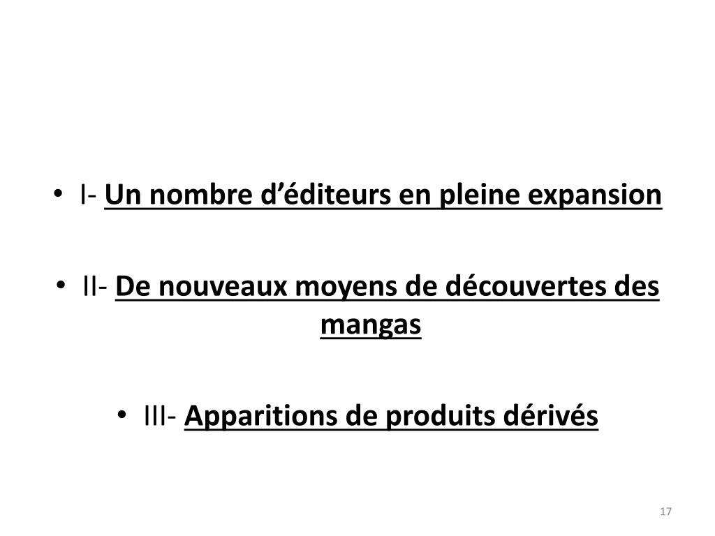 I- Un nombre d’éditeurs en pleine expansion • II- De nouveaux moyens de découvertes des mangas • III- Apparitions de produits dérivés
