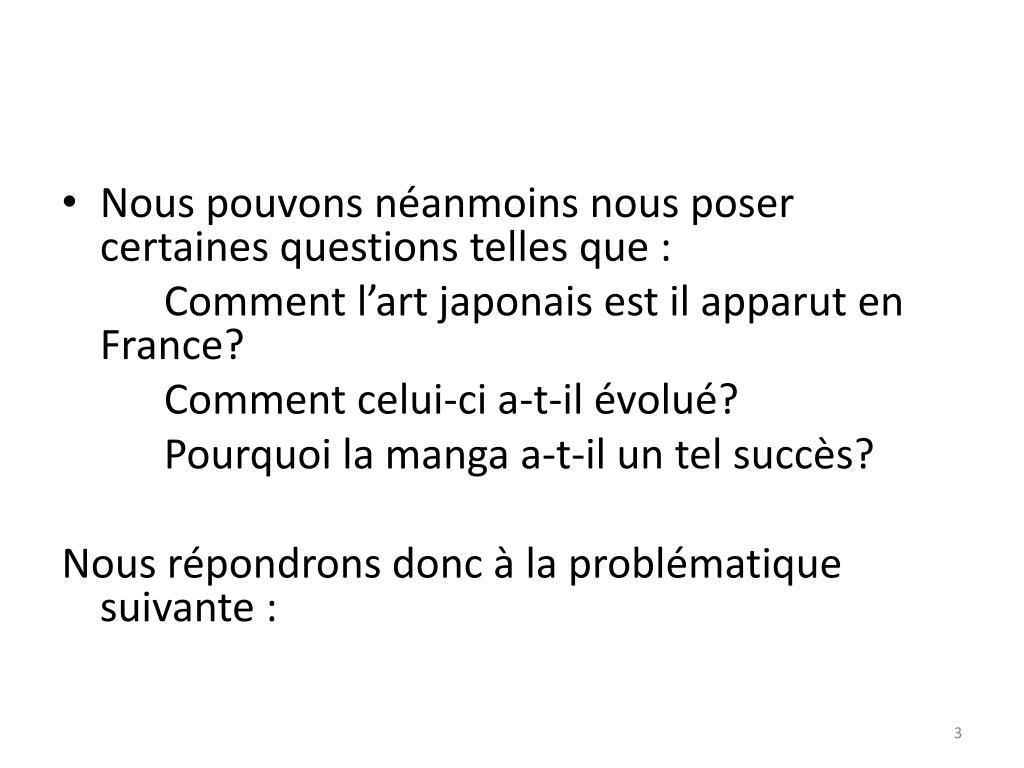 Nous pouvons néanmoins nous poser certaines questions telles que : Comment l’art japonais est il apparut en France? Comment celui-ci a-t-il évolué? Pourquoi la manga a-t-il un tel succès? Nous répondrons donc à la problématique suivante :