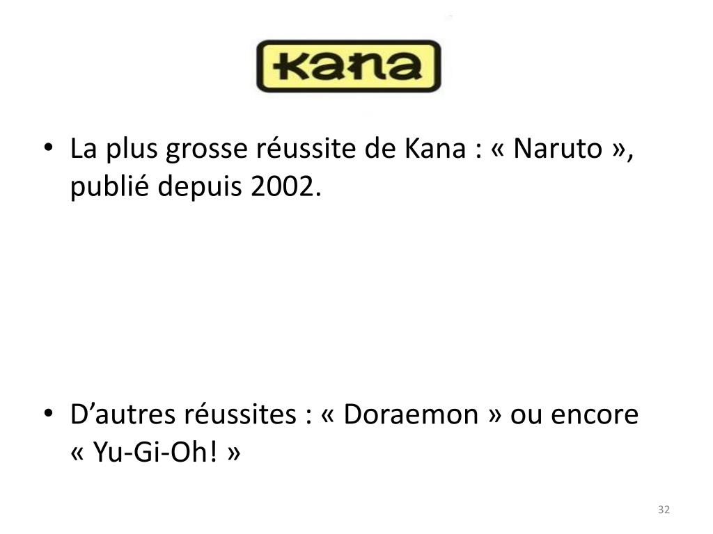 La plus grosse réussite de Kana : « Naruto », publié depuis 2002. • D’autres réussites : « Doraemon » ou encore « Yu-Gi-Oh! »