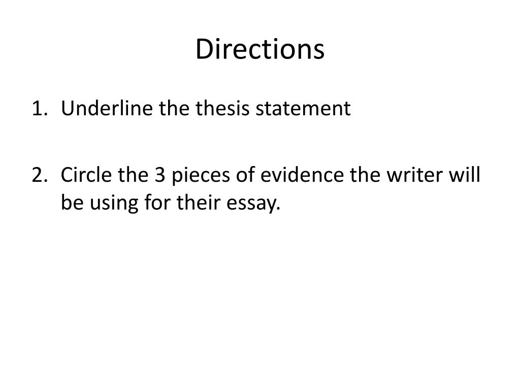 Directions • Underline the thesis statement • Circle the 3 pieces of evidence the writer will be using for their essay.