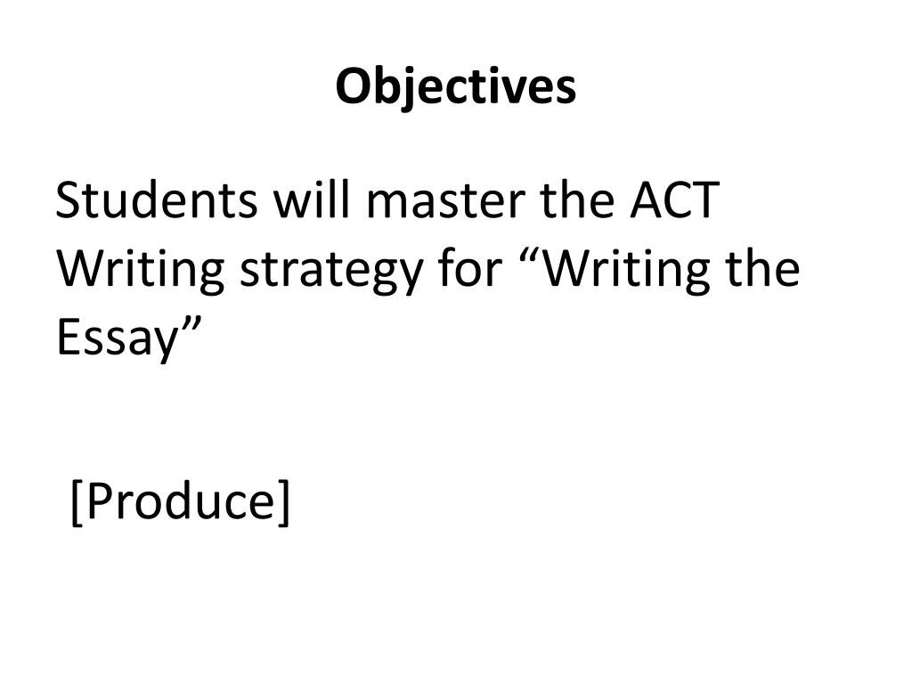 Objectives Students will master the ACT Writing strategy for “Writing the Essay” [Produce]