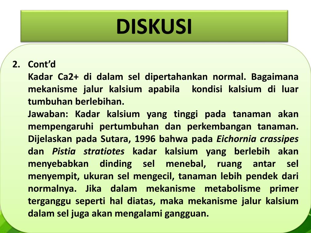 DISKUSI Cont’d Kadar Ca2+ didalamseldipertahankan normal. Bagaimanamekanismejalurkalsiumapabilakondisikalsiumdiluartumbuhanberlebihan. Jawaban: Kadar kalsium yang tinggipadatanamanakanmempengaruhipertumbuhandanperkembangantanaman. DijelaskanpadaSutara, 1996 bahwapadaEichorniacrassipesdanPistiastratioteskadarkalsium yang berlebihakanmenyebabkandindingselmenebal, ruangantarselmenyempit, ukuranselmengecil, tanamanlebihpendekdarinormalnya. Jikadalammekanismemetabolisme primer terganggusepertihaldiatas, makamekanismejalurkalsiumdalamseljugaakanmengalamigangguan.