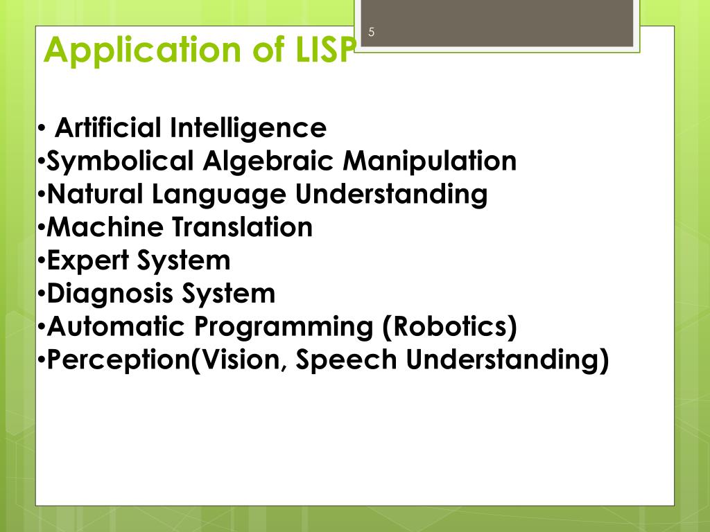 Application of LISP • Artificial Intelligence • Symbolical Algebraic Manipulation • Natural Language Understanding • Machine Translation • Expert System • Diagnosis System • Automatic Programming (Robotics) • Perception(Vision, Speech Understanding)