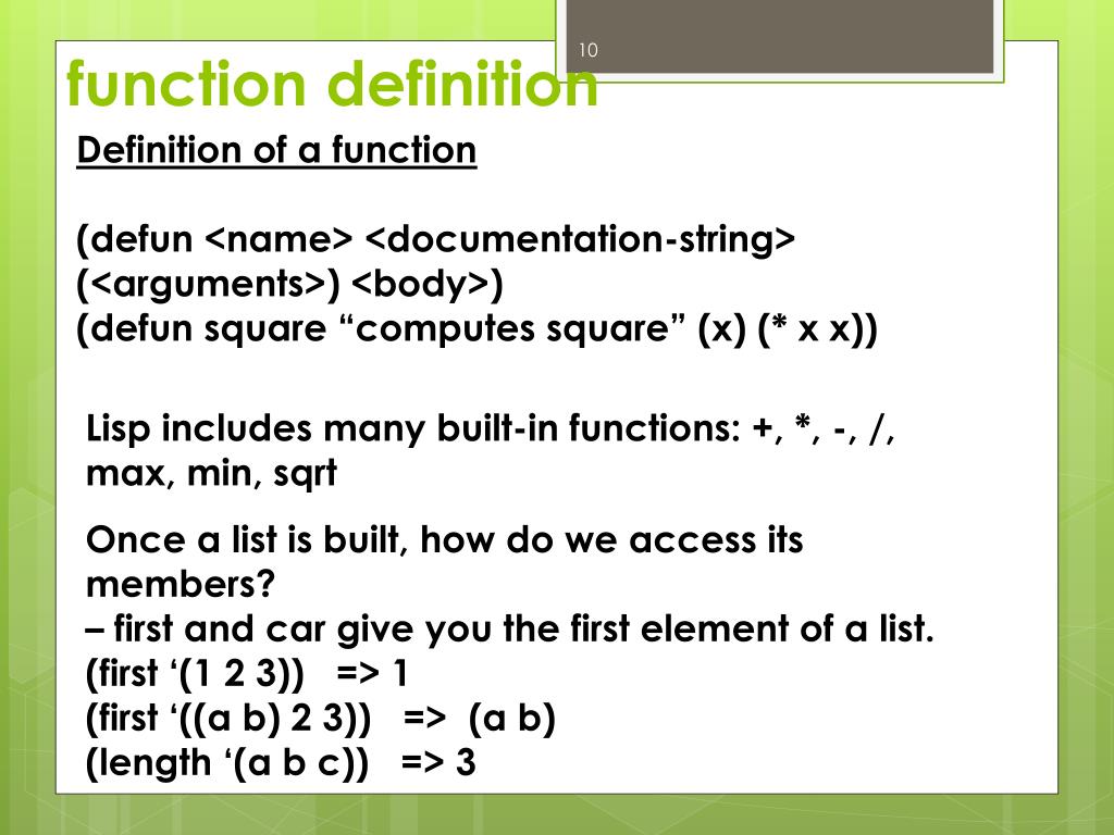 Definition of a function (defun <name> <documentation-string> (<arguments>) <body>) (defun square “computes square” (x) (* x x)) function definition Lisp includes many built-in functions: +, *, -, /, max, min, sqrt Once a list is built, how do we access its members? – first and car give you the first element of a list. (first ‘(1 2 3)) => 1 (first ‘((a b) 2 3)) => (a b) (length ‘(a b c)) => 3