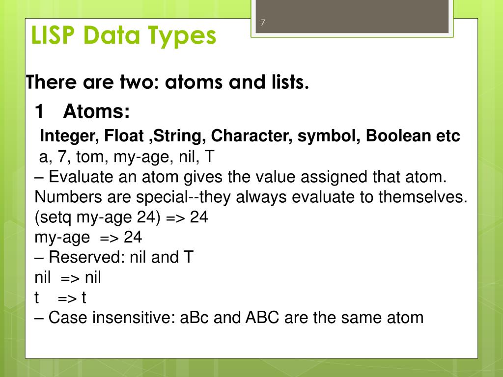 LISP Data Types There are two: atoms and lists. • Atoms: • Integer, Float ,String, Character, symbol, Boolean etc • a, 7, tom, my-age, nil, T • – Evaluate an atom gives the value assigned that atom. • Numbers are special--they always evaluate to themselves. • (setq my-age 24) => 24 • my-age => 24 • – Reserved: nil and T • nil => nil • t => t • – Case insensitive: aBc and ABC are the same atom