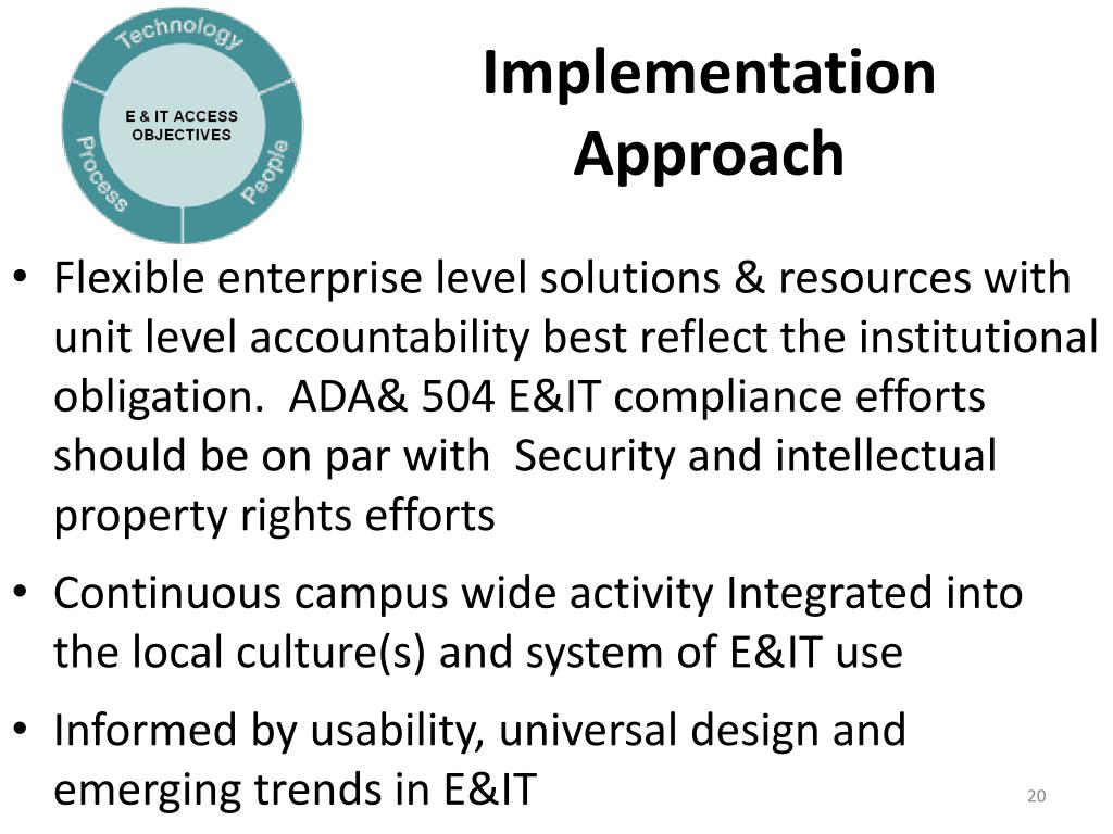 Implementation Approach • Flexible enterprise level solutions & resources with unit level accountability best reflect the institutional obligation. ADA& 504 E&IT compliance efforts should be on par with Security and intellectual property rights efforts • Continuous campus wide activity Integrated into the local culture(s) and system of E&IT use • Informed by usability, universal design and emerging trends in E&IT