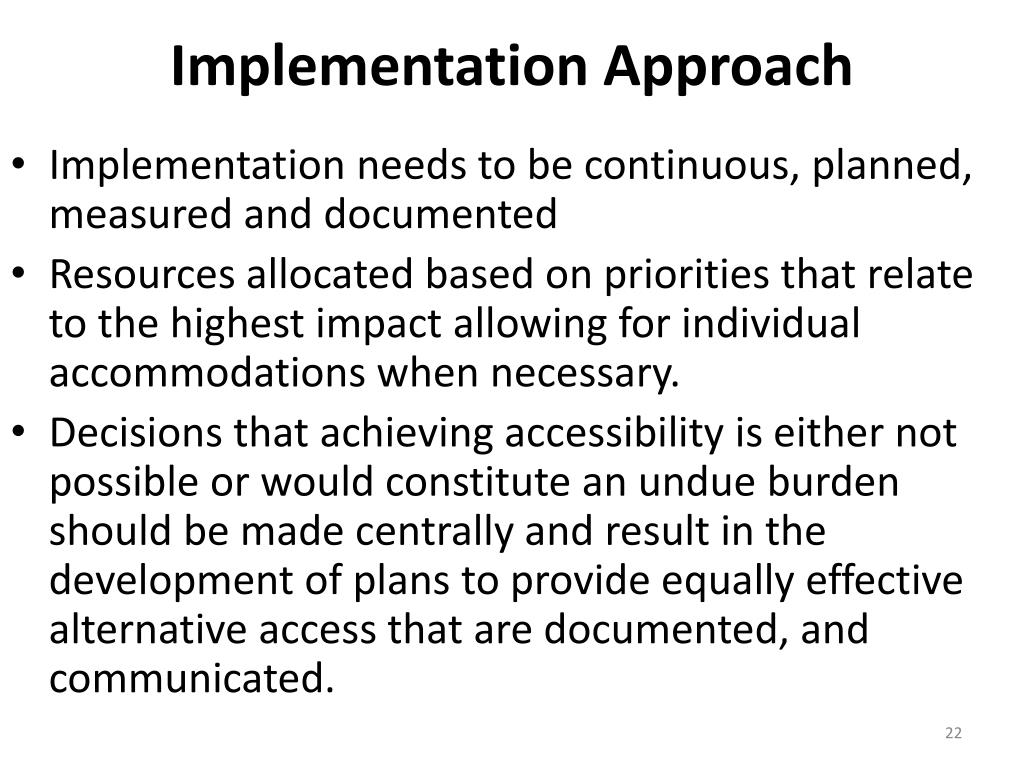 Implementation Approach • Implementation needs to be continuous, planned, measured and documented • Resources allocated based on priorities that relate to the highest impact allowing for individual accommodations when necessary. • Decisions that achieving accessibility is either not possible or would constitute an undue burden should be made centrally and result in the development of plans to provide equally effective alternative access that are documented, and communicated.