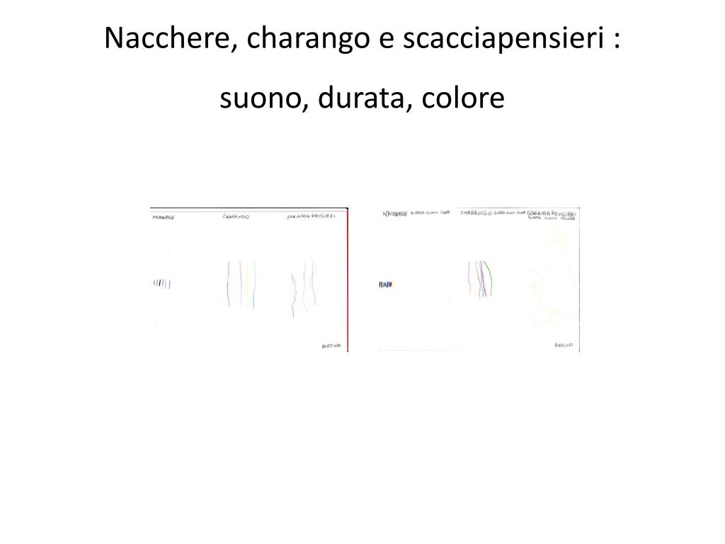 Gioco: le linee dei suoni Abbiamo mostrato tutti gli strumenti musicali della storia ai bambini, invitando ognuno di loro a sceglierne uno e a produrre un suono, lungo, corto, acuto, breve, etc. I suoni sono stati prodotti individualmente e ad una breve distanza di tempo l’uno dall’altro, così che i bambini hanno avuto la possibilità di fissarne la sensazione percettiva. Dopo l’esperienza, ad ognuno di loro è stato distribuito un foglio con un punto colorato disegnato al centro che ai bambini è stato presentato come l’inizio di ogni linea dei suoni. Quindi sono stati prodotti dei suoni con tutti gli strumenti della storia ed è stata data ai bambini la consegna di disegnare il suono emesso, a partire dal punto centrale del foglio. I suoni sono naturalmente diversi e differenziati nella durata e nell’intensità, così da offrire varie stimolazioni percettive da rappresentare con diversi colori. Il lavoro ultimato è risultato vario nel segno e nel colore, e rappresenta un prodotto visibile e tangibile per leggere un linguaggio sonoro.