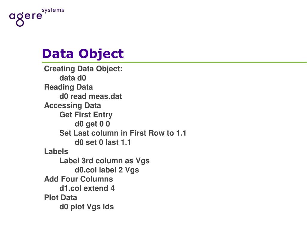 Data Object • Creating Data Object: • data d0 • Reading Data • d0 read meas.dat • Accessing Data • Get First Entry • d0 get 0 0 • Set Last column in First Row to 1.1 • d0 set 0 last 1.1 • Labels • Label 3rd column as Vgs • d0.col label 2 Vgs • Add Four Columns • d1.col extend 4 • Plot Data • d0 plot Vgs Ids