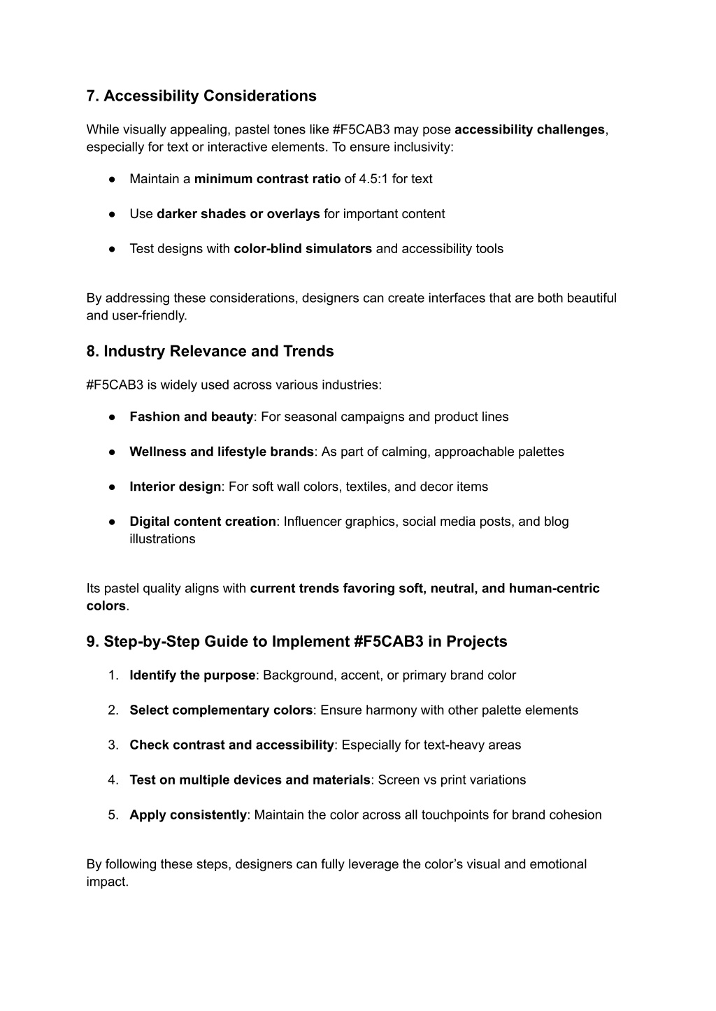7. Accessibility Considerations While visually appealing, pastel tones like #F5CAB3 may pose accessibility challenges, especially for text or interactive elements. To ensure inclusivity: ● Maintain a minimum contrast ratio of 4.5:1 for text ● Use darker shades or overlays for important content ● Test designs with color-blind simulators and accessibility tools By addressing these considerations, designers can create interfaces that are both beautiful and user-friendly. 8. Industry Relevance and Trends #F5CAB3 is widely used across various industries: ● Fashion and beauty: For seasonal campaigns and product lines ● Wellness and lifestyle brands: As part of calming, approachable palettes ● Interior design: For soft wall colors, textiles, and decor items ● Digital content creation: Influencer graphics, social media posts, and blog illustrations Its pastel quality aligns with current trends favoring soft, neutral, and human-centric colors. 9. Step-by-Step Guide to Implement #F5CAB3 in Projects 1. Identify the purpose: Background, accent, or primary brand color 2. Select complementary colors: Ensure harmony with other palette elements 3. Check contrast and accessibility: Especially for text-heavy areas 4. Test on multiple devices and materials: Screen vs print variations 5. Apply consistently: Maintain the color across all touchpoints for brand cohesion By following these steps, designers can fully leverage the color’s visual and emotional impact.
