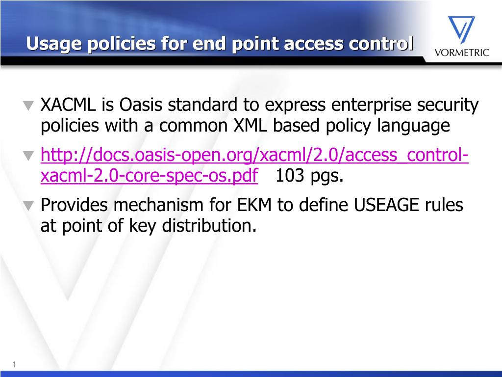 Usage policies for end point access control • XACML is Oasis standard to express enterprise security policies with a common XML based policy language • http://docs.oasis-open.org/xacml/2.0/access_control-xacml-2.0-core-spec-os.pdf 103 pgs. • Provides mechanism for EKM to define USEAGE rules at point of key distribution.
