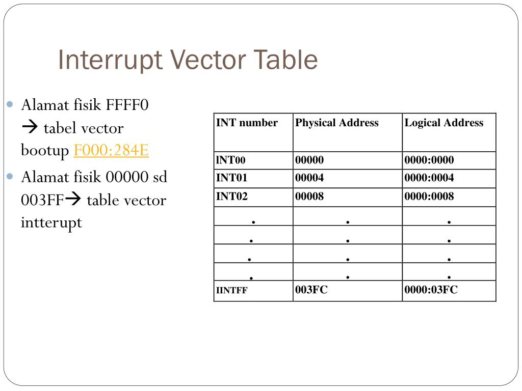 Alamatfisik FFFF0 tabel vector bootupF000:284E Alamatfisik 00000 sd 003FF table vector intterupt Interrupt Vector Table