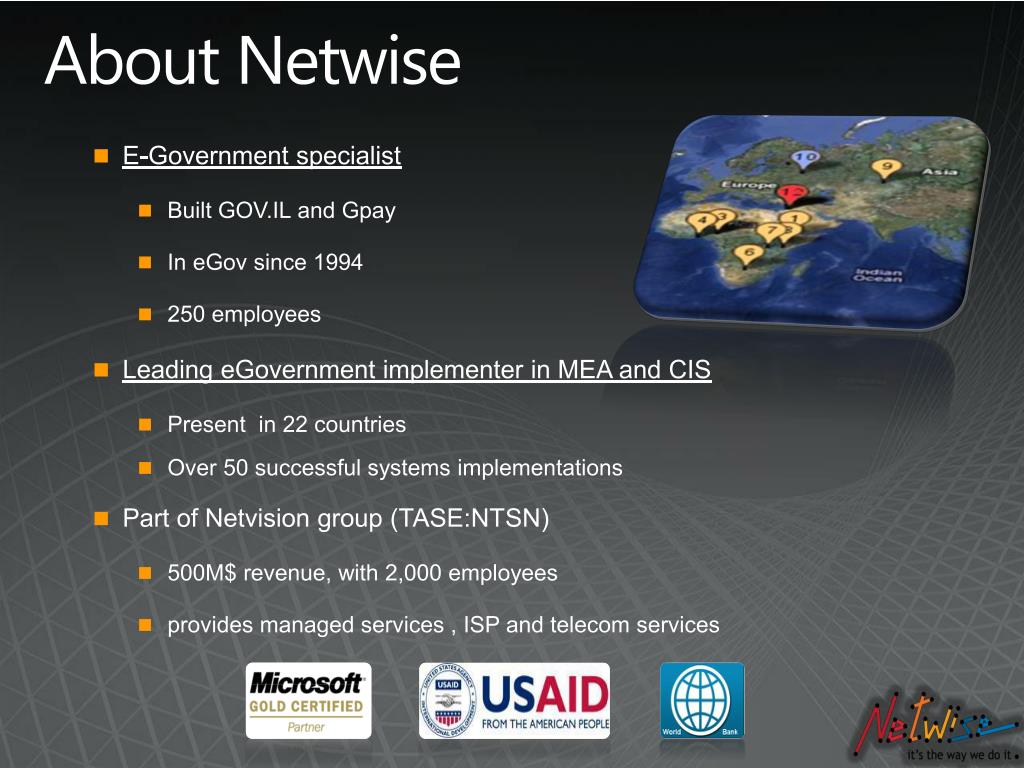 About Netwise • E-Government specialist • Built GOV.IL and Gpay • In eGov since 1994 • 250 employees • Leading eGovernment implementer in MEA and CIS • Present in 22 countries • Over 50 successful systems implementations • Part of Netvision group (TASE:NTSN) • 500M$ revenue, with 2,000 employees • provides managed services , ISP and telecom services