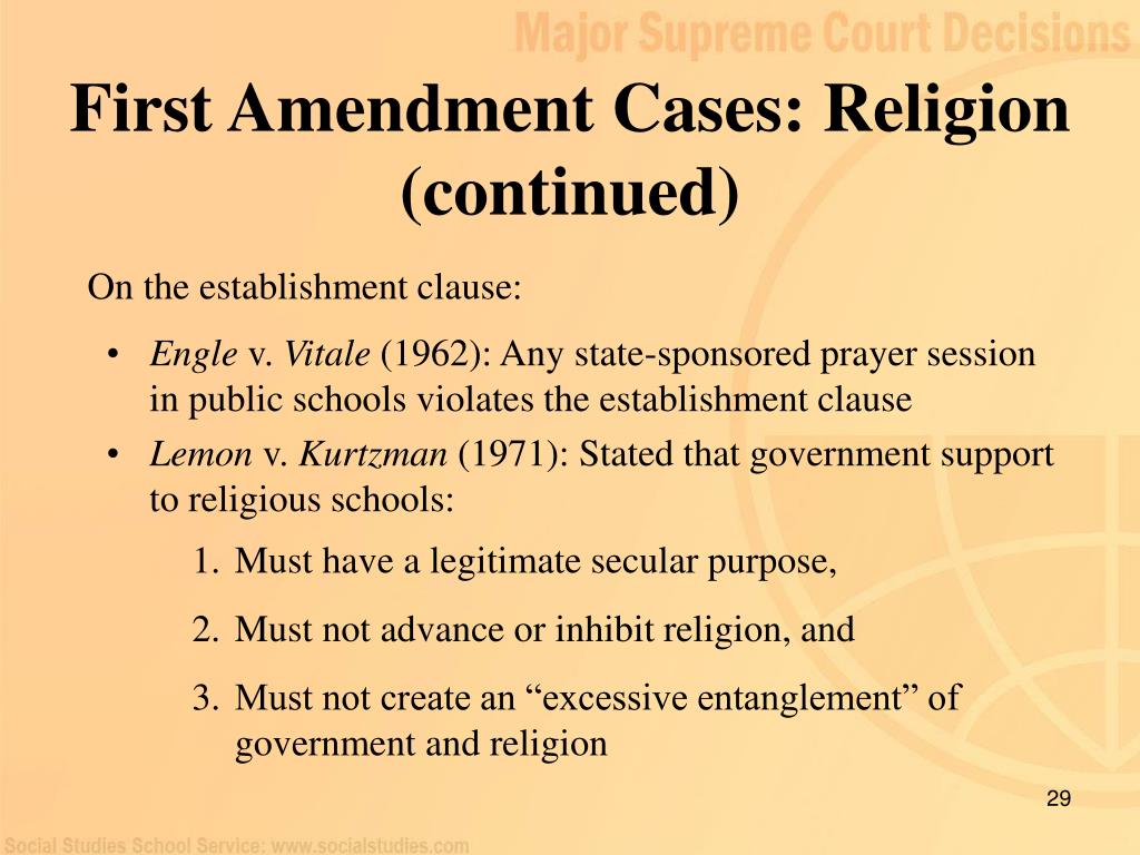 First Amendment Cases: Religion (continued) • Engle v. Vitale (1962): Any state-sponsored prayer session in public schools violates the establishment clause • Lemon v. Kurtzman (1971): Stated that government support to religious schools: On the establishment clause: • Must have a legitimate secular purpose, • Must not advance or inhibit religion, and • Must not create an “excessive entanglement” of government and religion