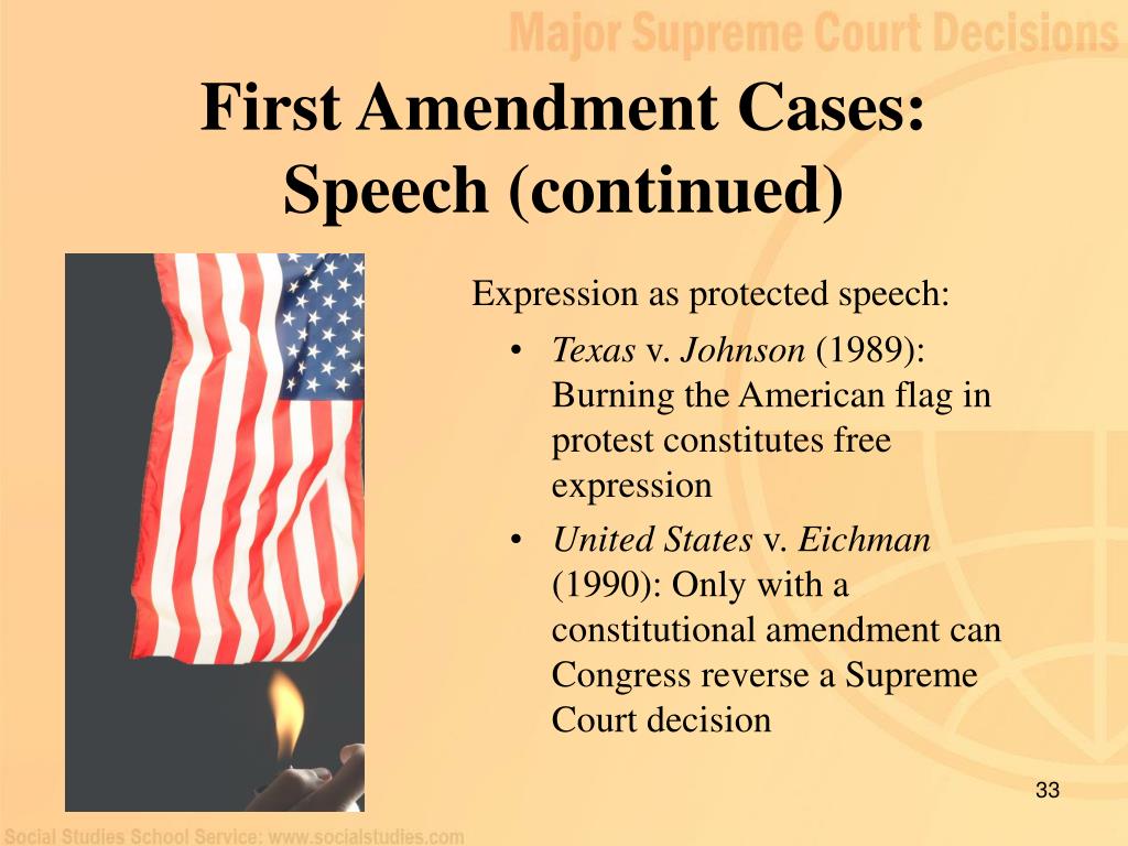 First Amendment Cases:Speech (continued) • Texas v. Johnson (1989): Burning the American flag in protest constitutes free expression • United States v. Eichman (1990): Only with a constitutional amendment can Congress reverse a Supreme Court decision Expression as protected speech: