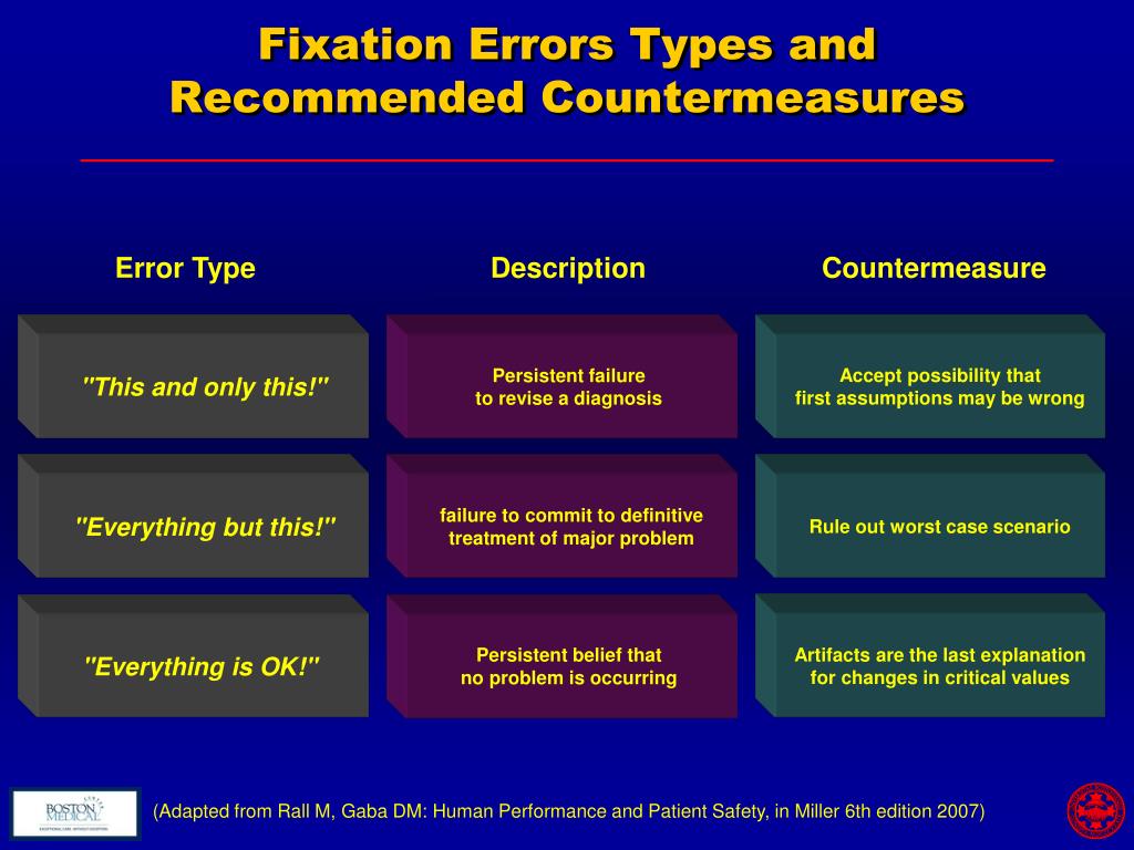 "This and only this!" Accept possibility that first assumptions may be wrong Persistent failure to revise a diagnosis Rule out worst case scenario "Everything but this!" failure to commit to definitive treatment of major problem Artifacts are the last explanation for changes in critical values "Everything is OK!" Persistent belief that no problem is occurring Fixation Errors Types and Recommended Countermeasures Error Type Description Countermeasure (Adapted from Rall M, Gaba DM: Human Performance and Patient Safety, in Miller 6th edition 2007)
