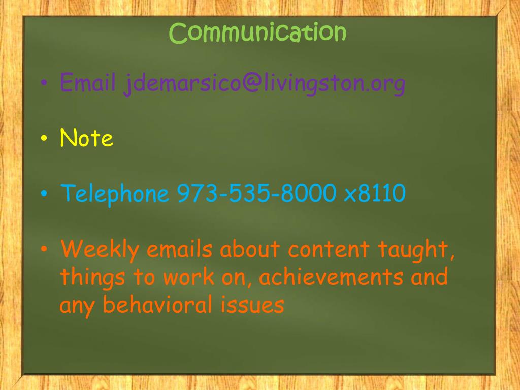 Communication • Email jdemarsico@livingston.org • Note • Telephone 973-535-8000 x8110 • Weekly emails about content taught, things to work on, achievements and any behavioral issues