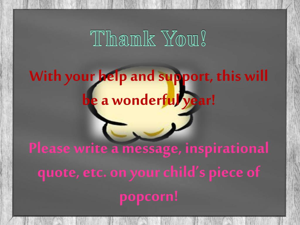 Thank You! • With your help and support, this will be a wonderful year! • Please write a message, inspirational quote, etc. on your child’s piece of popcorn!