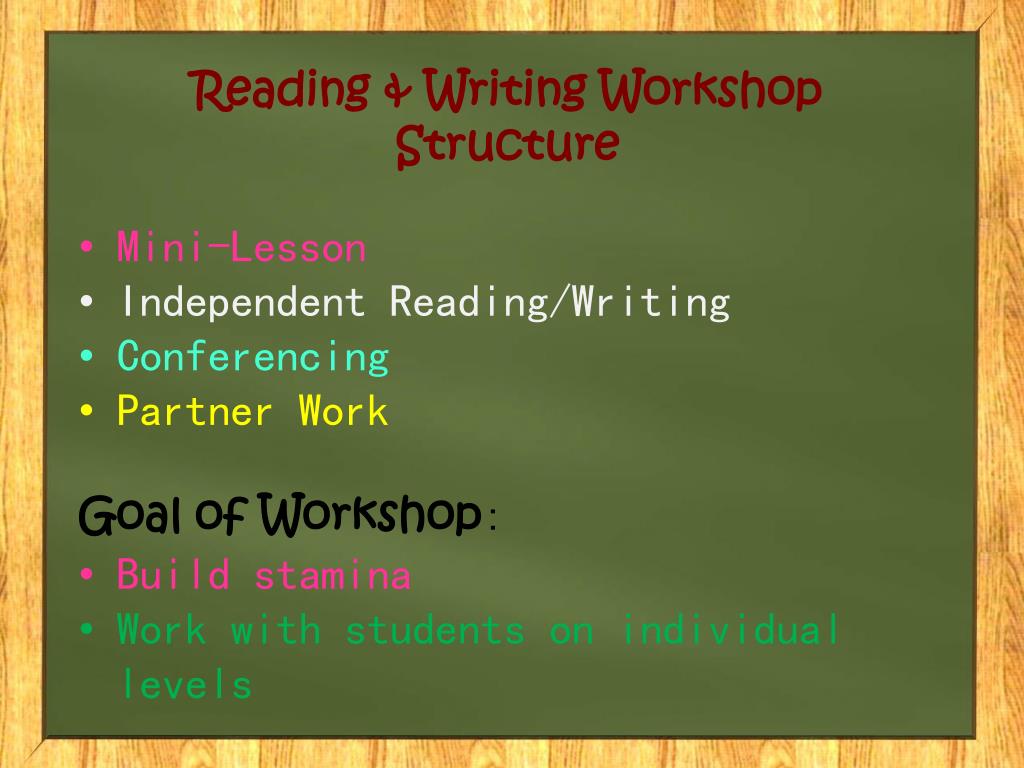 Reading & Writing Workshop Structure • Mini-Lesson • Independent Reading/Writing • Conferencing • Partner Work • Goal of Workshop: • Build stamina • Work with students on individual levels