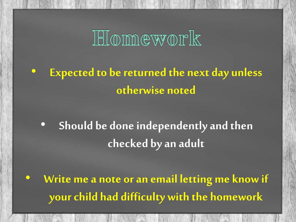 Homework • Expected to be returned the next day unless otherwise noted • Should be done independently and then checked by an adult • Write me a note or an email letting me know if your child had difficulty with the homework