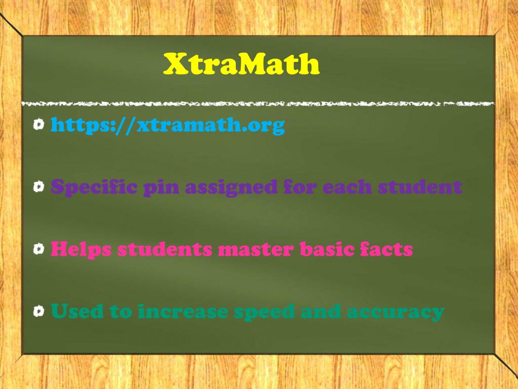 XtraMath • https://xtramath.org • Specific pin assigned for each student • Helps students master basic facts • Used to increase speed and accuracy