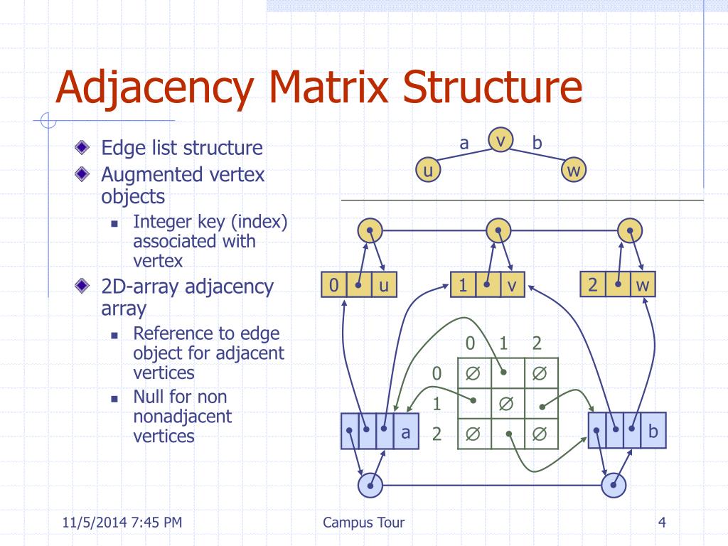 Adjacency Matrix Structure a v b • Edge list structure • Augmented vertex objects • Integer key (index) associated with vertex • 2D-array adjacency array • Reference to edge object for adjacent vertices • Null for non nonadjacent vertices u w 2 w 0 u 1 v b a Campus Tour
