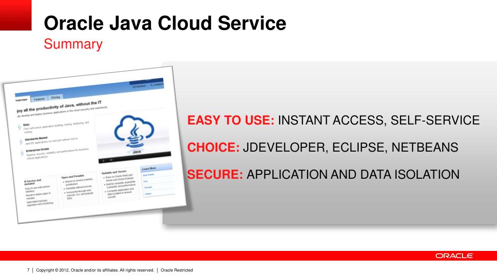 Oracle Java Cloud Service EASY TO USE: instant access, Self-service CHOICE: JDeveloper, Eclipse, NetBeans SECURE: application and data isolation Summary