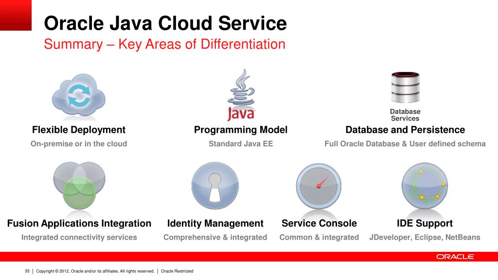 Oracle Java Cloud Service Summary – Key Areas of Differentiation Database Services Flexible Deployment On-premise or in the cloud Programming Model Standard Java EE Database and Persistence Full Oracle Database & User defined schema Fusion Applications Integration Integrated connectivity services Identity Management Comprehensive & integrated Service Console Common & integrated IDE Support JDeveloper, Eclipse, NetBeans