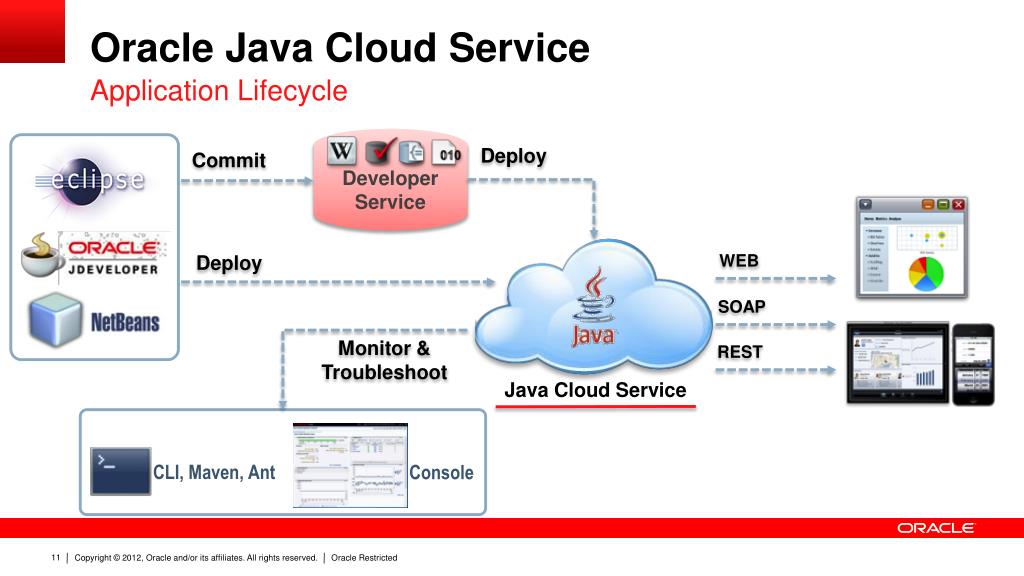 Oracle Java Cloud Service Application Lifecycle Deploy Commit Developer Service WEB REST SOAP Deploy Monitor & Troubleshoot Java Cloud Service CLI, Maven, Ant Console