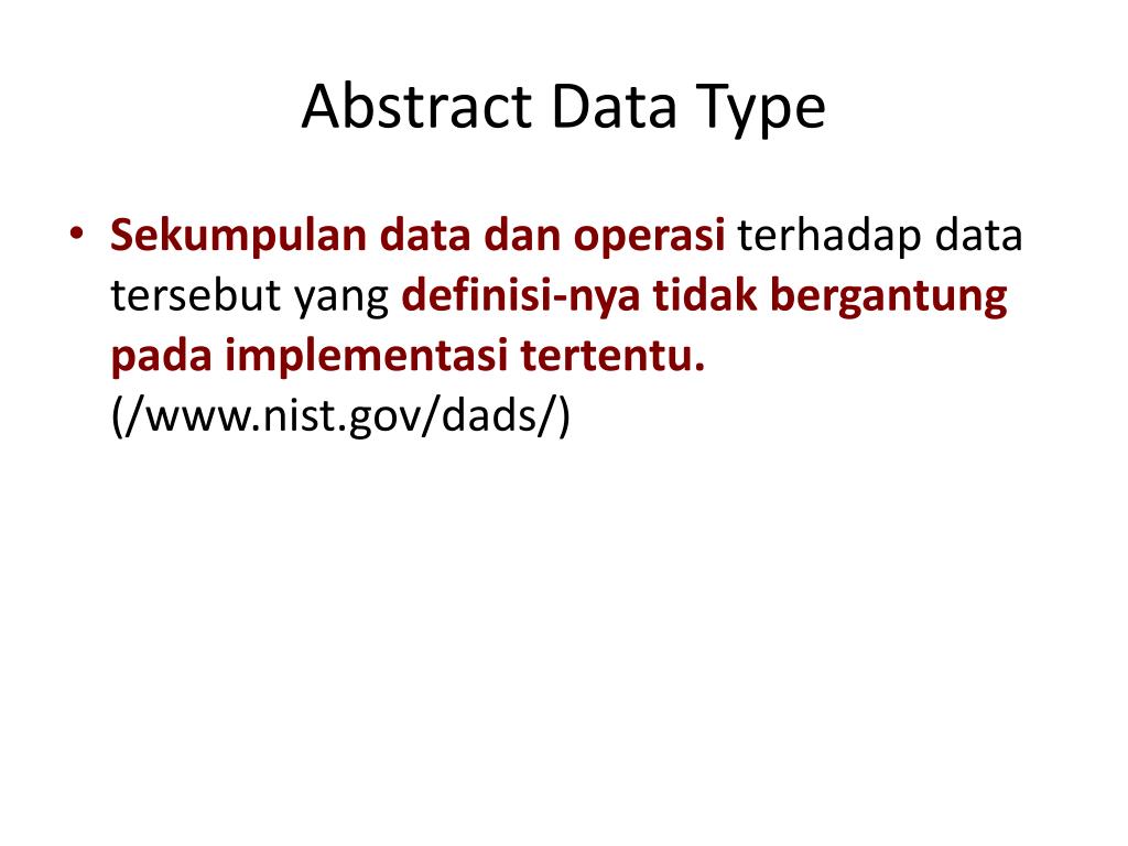 Abstract Data Type • Sekumpulan data dan operasi terhadap data tersebut yang definisi-nya tidak bergantung pada implementasi tertentu. (/www.nist.gov/dads/)