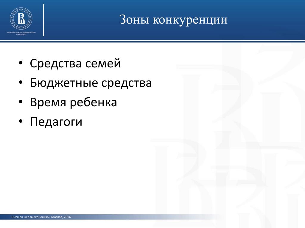 Зоны конкуренции • Средства семей • Бюджетные средства • Время ребенка • Педагоги Высшая школа экономики, Москва, 2014