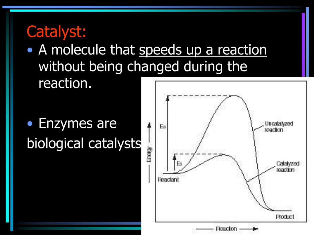 Catalyst: • A molecule that speeds up a reaction without being changed during the reaction. • Enzymes are biological catalysts.