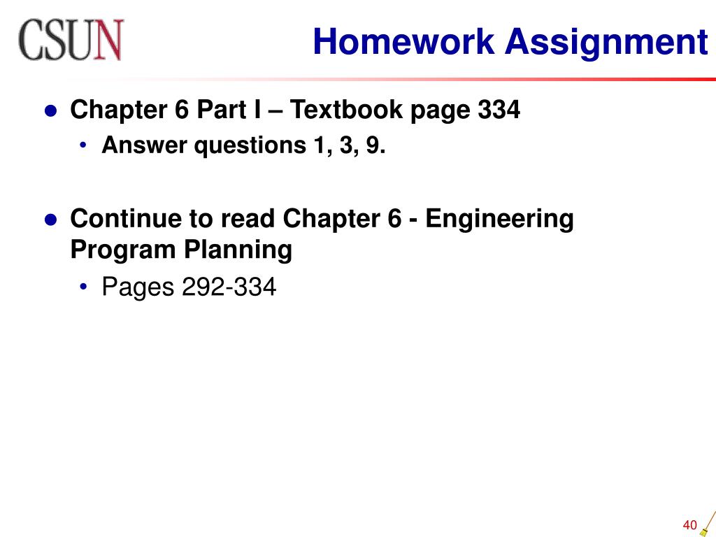 Homework Assignment • Chapter 6 Part I – Textbook page 334 • Answer questions 1, 3, 9. • Continue to read Chapter 6 - Engineering Program Planning • Pages 292-334
