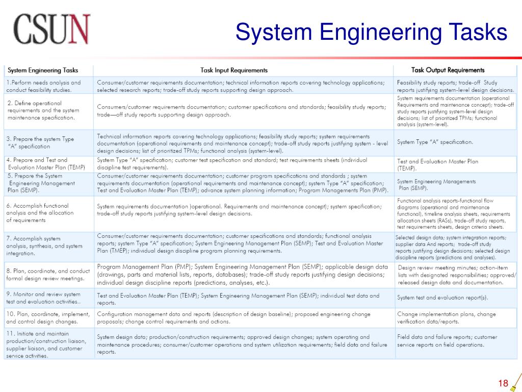 Definition of System Engineering Tasks (cont.) • Critical tasks • Accomplish system synthesis, analysis, and design integration functions on a continuing basis throughout the overall design and development process • Plan, coordinate, and conduct formal design reviews meetings • Monitor and review system test and evaluation activities • Plan, coordinate, implement, and control design changes • Initiate and maintain production and supplier liaison, and customer service activities