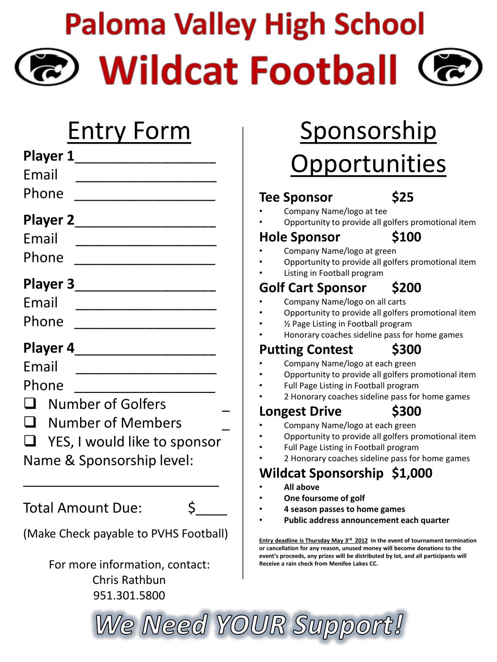 Paloma Valley High School Wildcat Football Entry Form Player 1__________________ Email __________________ Phone __________________ Player 2__________________ Email __________________ Phone __________________ Player 3__________________ Email __________________ Phone __________________ Player 4__________________ Email __________________ Phone __________________ • Number of Golfers _ • Number of Members _ • YES, I would like to sponsor Name & Sponsorship level: _________________________ Total Amount Due: $____ (Make Check payable to PVHS Football) For more information, contact: Chris Rathbun 951.301.5800 Sponsorship Opportunities Tee Sponsor $25 • Company Name/logo at tee • Opportunity to provide all golfers promotional item Hole Sponsor $100 • Company Name/logo at green • Opportunity to provide all golfers promotional item • Listing in Football program Golf Cart Sponsor $200 • Company Name/logo on all carts • Opportunity to provide all golfers promotional item • ½ Page Listing in Football program • Honorary coaches sideline pass for home games Putting Contest $300 • Company Name/logo at each green • Opportunity to provide all golfers promotional item • Full Page Listing in Football program • 2 Honorary coaches sideline pass for home games Longest Drive $300 • Company Name/logo at each green • Opportunity to provide all golfers promotional item • Full Page Listing in Football program • 2 Honorary coaches sideline pass for home games Wildcat Sponsorship $1,000 • All above • One foursome of golf • 4 season passes to home games • Public address announcement each quarter Entry deadline is Thursday May 3rd 2012In the event of tournament termination or cancellation for any reason, unused money will become donations to the event’s proceeds, any prizes will be distributed by lot, and all participants will Receive a rain check from Menifee Lakes CC. We Need YOUR Support!
