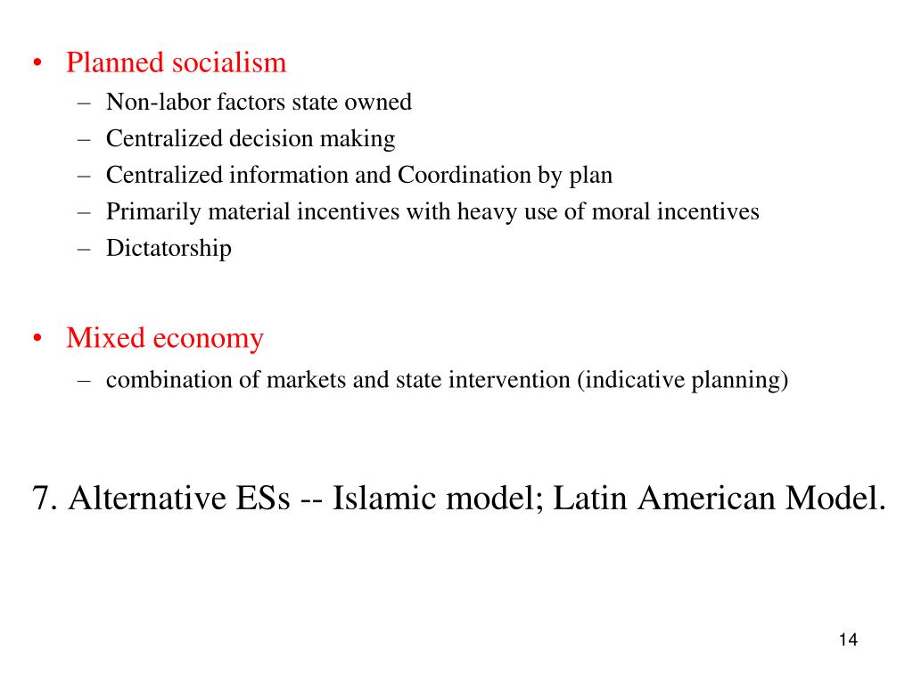 Planned socialism Non-labor factors state owned Centralized decision making Centralized information and Coordination by plan Primarily material incentives with heavy use of moral incentives Dictatorship Mixed economy combination of markets and state intervention (indicative planning) 7. Alternative ESs -- Islamic model; Latin American Model.