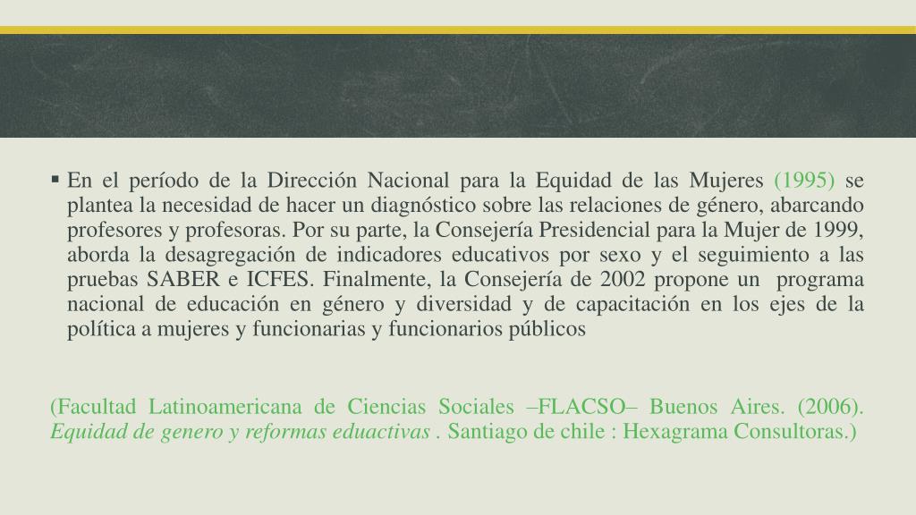En el período de la Dirección Nacional para la Equidad de las Mujeres (1995) se plantea la necesidad de hacer un diagnóstico sobre las relaciones de género, abarcando profesores y profesoras. Por su parte, la Consejería Presidencial para la Mujer de 1999, aborda la desagregación de indicadores educativos por sexo y el seguimiento a las pruebas SABER e ICFES. Finalmente, la Consejería de 2002 propone un programa nacional de educación en género y diversidad y de capacitación en los ejes de la política a mujeres y funcionarias y funcionarios públicos (Facultad Latinoamericana de Ciencias Sociales –FLACSO– Buenos Aires. (2006). Equidad de genero y reformas eduactivas . Santiago de chile : Hexagrama Consultoras.)