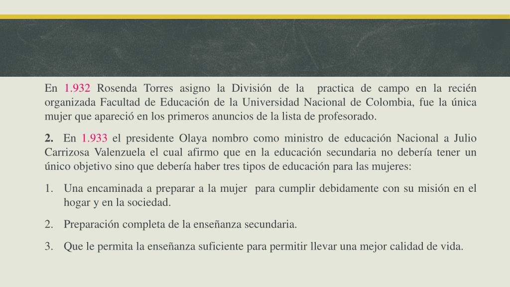 En 1.932 Rosenda Torres asigno la División de la practica de campo en la recién organizada Facultad de Educación de la Universidad Nacional de Colombia, fue la única mujer que apareció en los primeros anuncios de la lista de profesorado. 2. En 1.933 el presidente Olaya nombro como ministro de educación Nacional a Julio Carrizosa Valenzuela el cual afirmo que en la educación secundaria no debería tener un único objetivo sino que debería haber tres tipos de educación para las mujeres: • Una encaminada a preparar a la mujer para cumplir debidamente con su misión en el hogar y en la sociedad. • Preparación completa de la enseñanza secundaria. • Que le permita la enseñanza suficiente para permitir llevar una mejor calidad de vida.