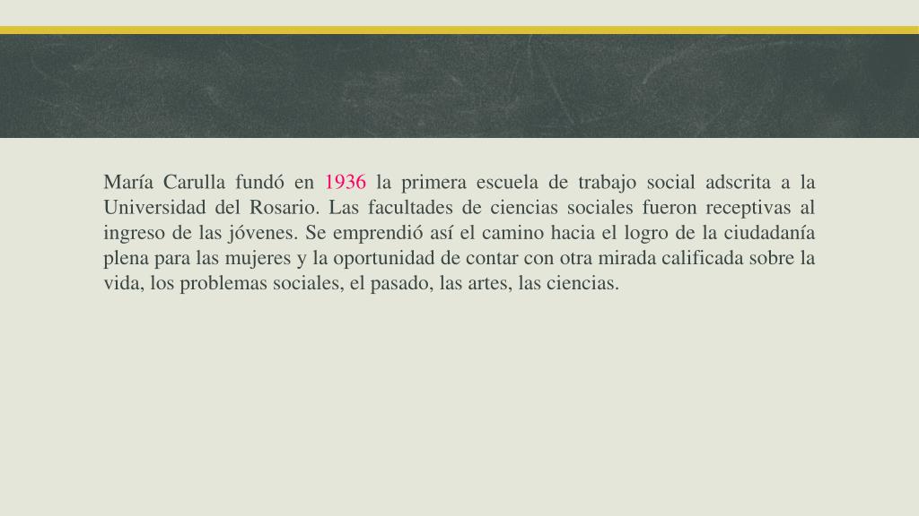 María Carulla fundó en 1936 la primera escuela de trabajo social adscrita a la Universidad del Rosario. Las facultades de ciencias sociales fueron receptivas al ingreso de las jóvenes. Se emprendió así el camino hacia el logro de la ciudadanía plena para las mujeres y la oportunidad de contar con otra mirada calificada sobre la vida, los problemas sociales, el pasado, las artes, las ciencias.