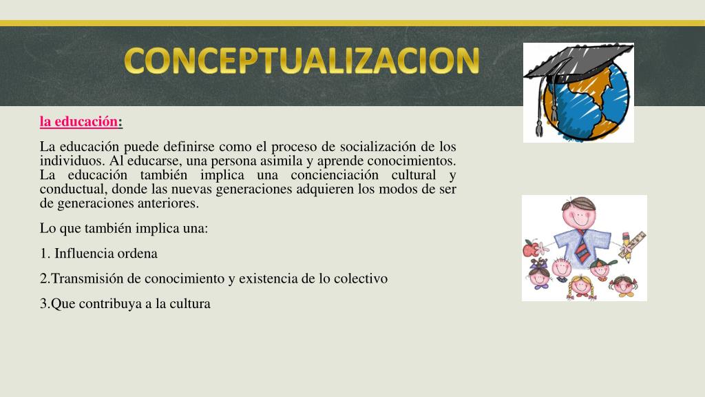 CONCEPTUALIZACION la educación: La educación puede definirse como el proceso de socialización de los individuos. Al educarse, una persona asimila y aprende conocimientos. La educación también implica una concienciación cultural y conductual, donde las nuevas generaciones adquieren los modos de ser de generaciones anteriores. Lo que también implica una: 1. Influencia ordena 2.Transmisión de conocimiento y existencia de lo colectivo 3.Que contribuya a la cultura
