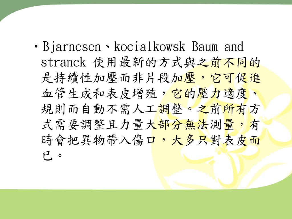 Bjarnesen、kocialkowsk Baum and stranck 使用最新的方式與之前不同的是持續性加壓而非片段加壓,它可促進血管生成和表皮增殖,它的壓力適度、規則而自動不需人工調整。之前所有方式需要調整且力量大部分無法測量,有時會把異物帶入傷口,大多只對表皮而已。