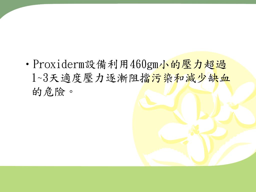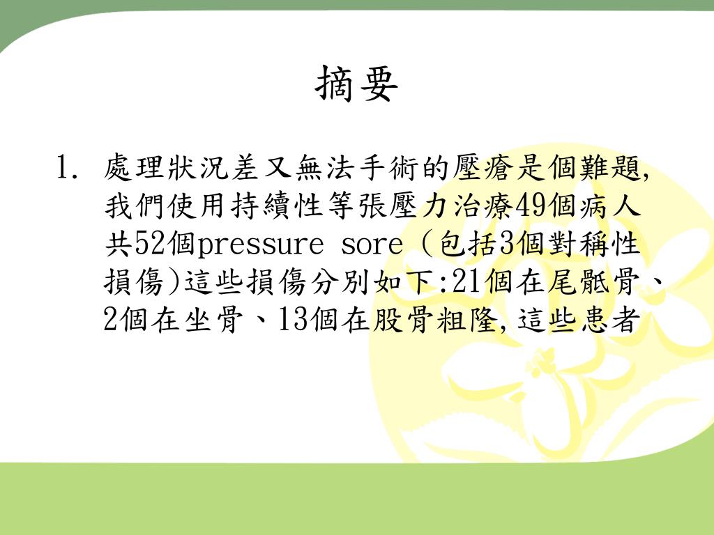 摘要 • 處理狀況差又無法手術的壓瘡是個難題,我們使用持續性等張壓力治療49個病人共52個pressure sore (包括3個對稱性損傷)這些損傷分別如下:21個在尾骶骨、 2個在坐骨、13個在股骨粗隆,這些患者
