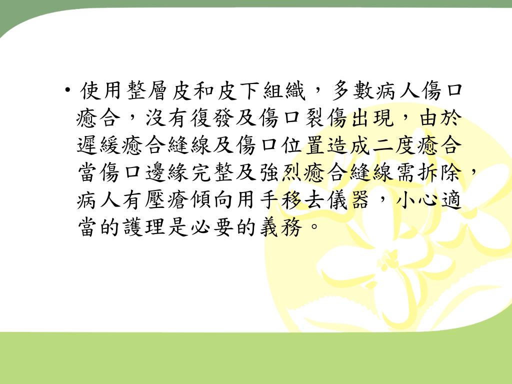 使用整層皮和皮下組織,多數病人傷口癒合,沒有復發及傷口裂傷出現,由於遲緩癒合縫線及傷口位置造成二度癒合當傷口邊緣完整及強烈癒合縫線需拆除,病人有壓瘡傾向用手移去儀器,小心適當的護理是必要的義務。使用整層皮和皮下組織,多數病人傷口癒合,沒有復發及傷口裂傷出現,由於遲緩癒合縫線及傷口位置造成二度癒合當傷口邊緣完整及強烈癒合縫線需拆除,病人有壓瘡傾向用手移去儀器,小心適當的護理是必要的義務。